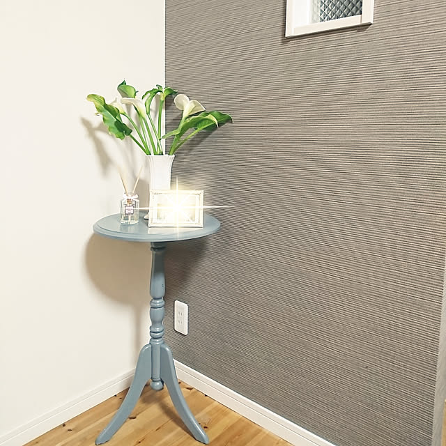 木目のダマスク柄でシャビーな雰囲気の輸入壁紙をはりました。