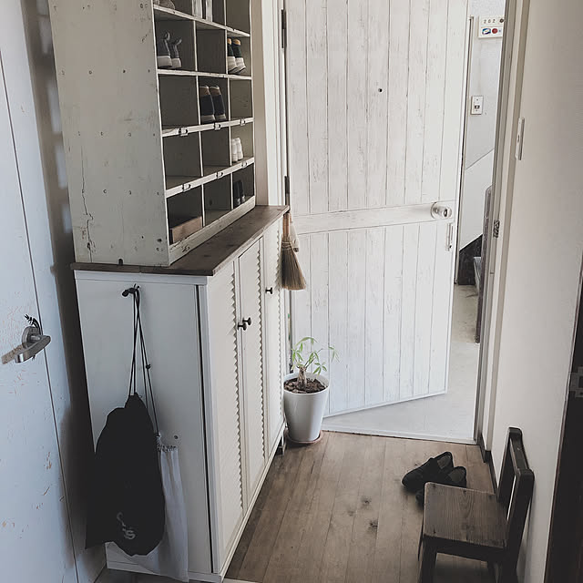 玄関床をリメイク! マステ×両面テープで貼ってます。 白くするだけで雰囲気がとても変わって嬉しい😊 次は靴箱DIY(現状靴箱なくてまさかの段ボール...)😤