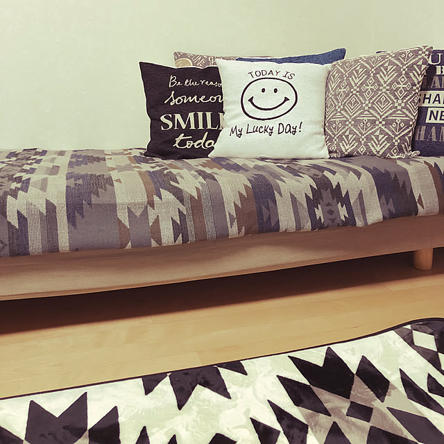 ニトリでソファカバー色々バラ買い! 揃えるんじゃなくてバラバラでも雰囲気おかしくないように悩んで買ったけど… 多分大丈夫…w 自信なくなってきた。 二個は元々のグレーのまま。 全部やったらうるさいかと思ったけど残り二個も替えたくなってきました。