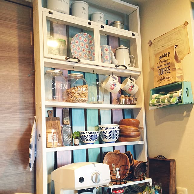 おはようございます♬*゜ 私の一番頑張ったDIYはこの食器棚 造り付けのバックカウンターだから市販の食器棚は幅が合わないし、素敵なのは高いし、ディスプレイ収納もしたいし… 部屋の雰囲気に馴染むようにするにはDIY! って事で頑張りました( •̀ᄇ• ́)ﻭ✧ DIYした板壁も一緒に手作り感ハンパないけど大好きなキッチンです❤