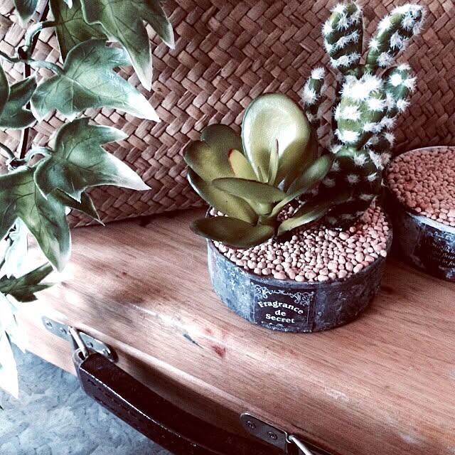 玄関入って左側にワイン箱?の上に置いてる物達です☺︎セリアで買ったブリキ缶に多肉ちゃんとワイヤープランツを植えてみました♪