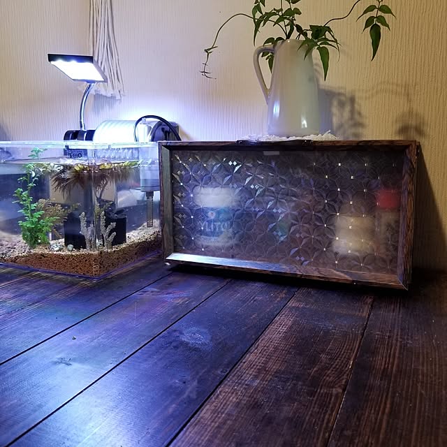 【ビオトープ】始めました♡ 始めることを「立ち上げる」って言うみたいですね😊場所は玄関先、出入りする時に通るので、癒しを分けてもらいます 姿は写っていませんが、たぶんメダカ4匹、エビ2匹がいるはずです👍 まだ水の中は不安定な状態なので、一番小さなメダカちゃんが⭐︎になってしまったけど、それも自然と割り切ってのんびりと観察しています♪♪ YouTubeなどで、色々な方のビオトープを見させてもらい、とても奥が深そうで面白そうです♡