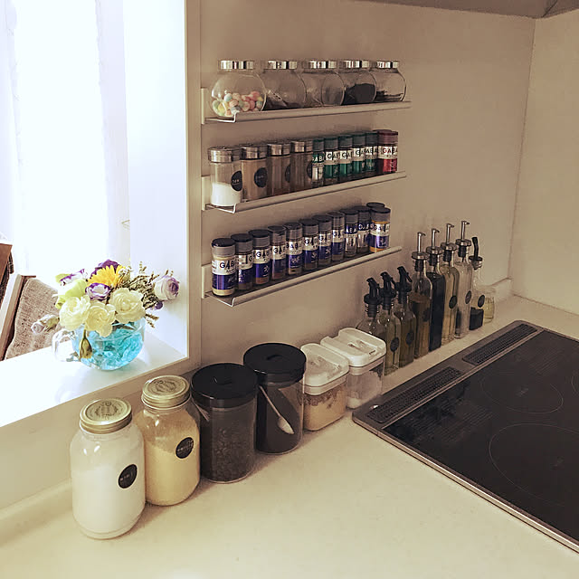 𝐇𝐞𝐥𝐥𝐨 ⸒⸒ 『お家の一番好きな場所』は、 リビング、ダイニングから見たキッチンです♡ 入居時に自分たちで取り付けたウォールシェルフは思い入れがあってお気に入りです☺︎ こっそり隠れたミッフィーちゃん‪やガラスのキャニスター、ブレッドケース、francfrancのフェイクフラワーなどお気に入りたちをいつでも視界に入るよう飾っています🌷.*