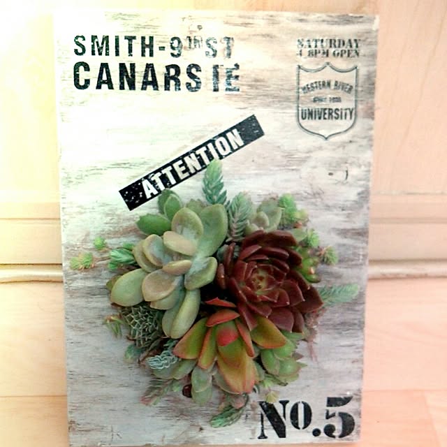多肉タブロー風ハンギング✨✨ 板は古材を使ってアイアンペイントで文字を書きました♥