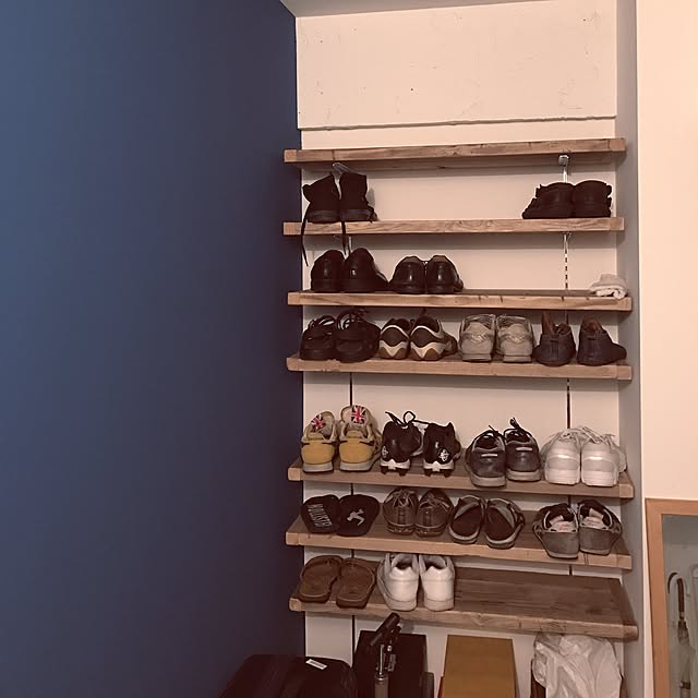 イベント参加です♪ 旦那さん自信作の玄関収納です しっかり採寸しロイヤルの金物を使って作りました。そのかいあってとっても使いやすいです! 最上段には蓋つきのケースに普段は使わない靴を、左側にはアウターを掛けています。日焼け防止にカーテンもつけちゃいました!真ん中段にはダイソーのプラケースに折り畳み傘等のお出かけグッズを。 左下の方にあるモールディングのトランクボックスには防災グッズを収納しています。ベンチがわりにもなって靴の脱ぎ着も楽チン