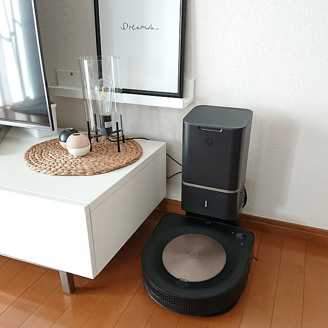 ルンバのホームの位置を変えました! リビング窓下→テレビ台の横 になりました! 目立たなくなった✌️ なんで最初からここにしなかったんだろう😂w𐤔ʷ 本来ホームの左右はもっと空間を空けるべきなんですが、今の状態は片側がテレビボードで詰まってます。 これでもしっかり稼働してるので問題なしです👍🏻