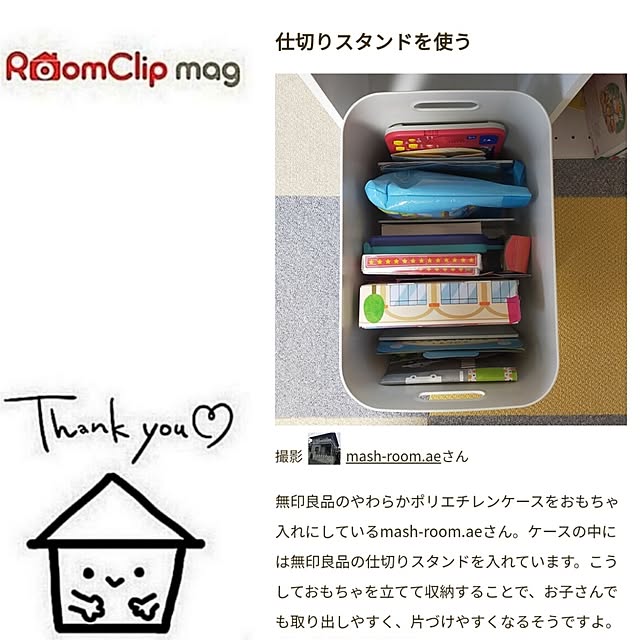 Room Clip mag 「すぐにでも試してみたい!床に物が散らからないようになる工夫」に掲載していただきました。 今の時期のような夏休み、 子供の宿題など イレギュラーな物が増えますよね。 そんな時に 子供でもできる 我が家の簡単収納を紹介していただきました♬