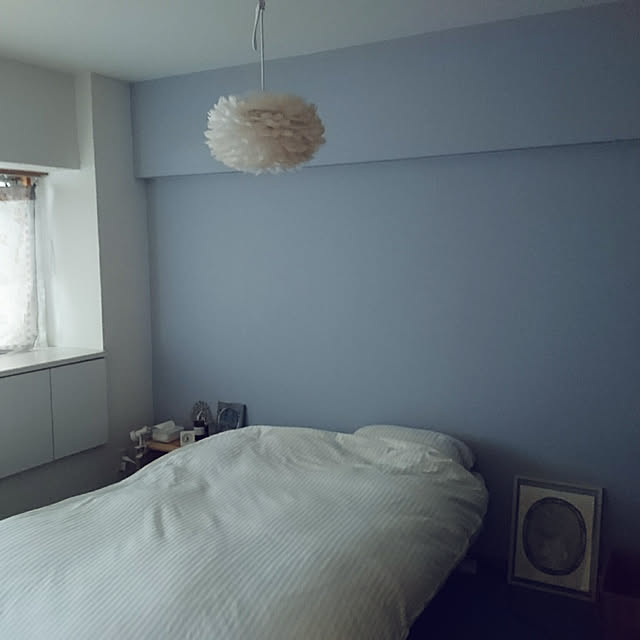 ベッドルームの壁は一面をブルーグレーにして休みやすい雰囲気にしています。 ライトは一目惚れした unico の羽でふわふわな物です。