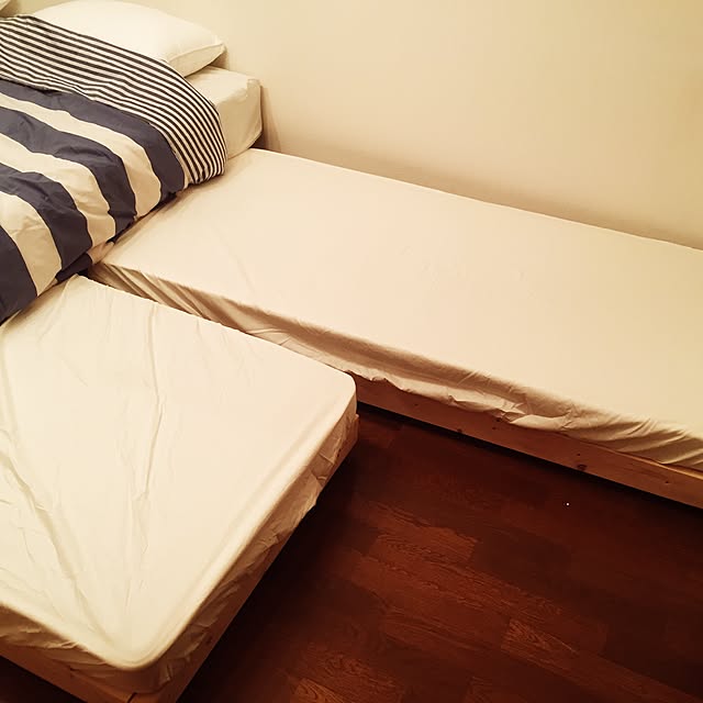 ベッドは、「一流ホテルのベッド」サイトの、「ポケットハードタイプ(片面ピローソフト仕様)」の「キングサイズ(上・下セット)」で、マットレスの上から「ベッドパッド」と「メイキングシーツ」でベッドメイクして、その上から「白無地」の「デュベ」と、「ベッドスロー」でコーディネート。ベッド下部の「ボックススプリングボトム」には「ベッドスカート」。頭元の枕は「ホテルペアピロー(+ピローカバー)」です。