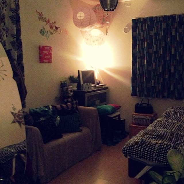 連投すみません(>_<)壁のディスプレイがだいぶ変わったのとクッションが増えたので久々に寝室全体写真♡