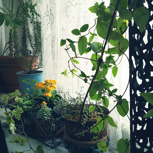 ① マイ寝室のグリーンも大分、外に出して少なくなりましたが窓辺のぶら下げグリーンは、そのままです💚