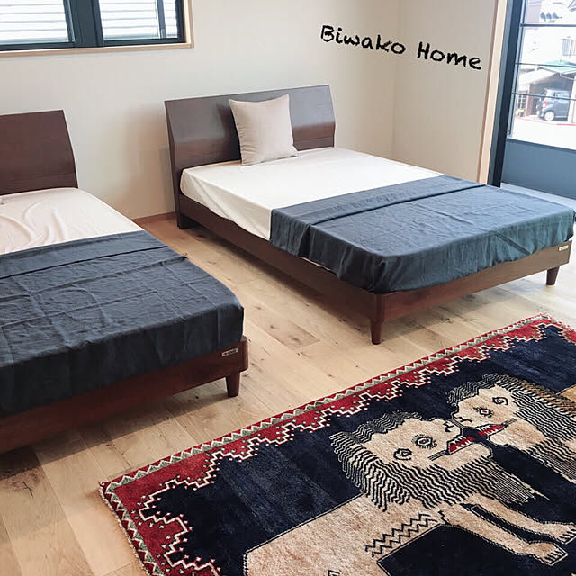 ベッド脇のマットはギャッベ。 羊毛100%なのにとても安く購入できました。 お手入れは掃除機とたまに日光に当てる程度でいつまで経ってもへたらず買ってよかったアイテムです。