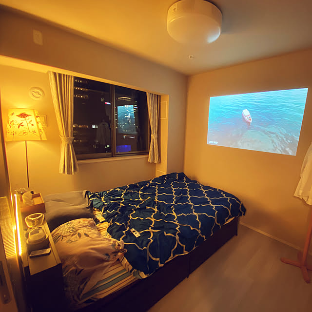写真は娘が絵本の朗読をpopln Aladdinにしてもらっているところです。お昼寝前でカーテンしてても暗くならない寝室ですがはっきりくっきり見えます。
