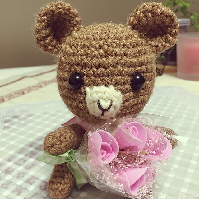 花束を持ったクマさん。プレゼント用に作ったあみぐるみです。
