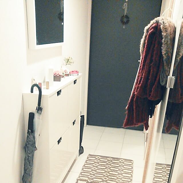 プレゼントでいただいたIKEAの ファブリックフレームを飾りました。 傘立ては場所を取るので、こんな感じで シューズボックスに掛けています。