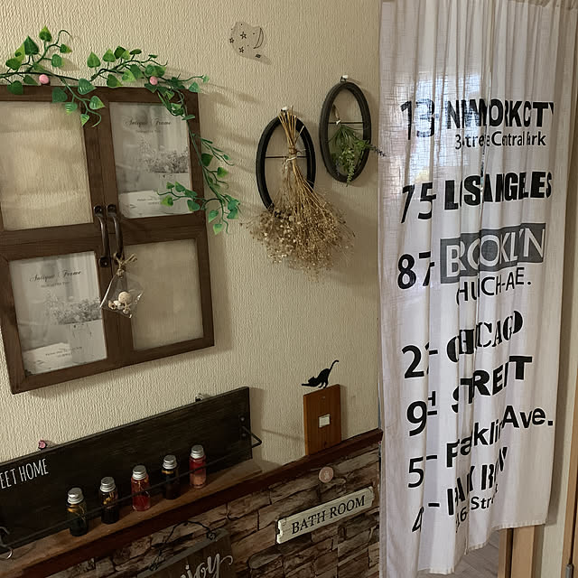 のれんのイベント 脱衣所にしまむらののれんをかけてます 狭くて階段から撮影したのでなかなかうまい具合に撮影できません😅 横にはハンドメイド作品飾ってます☺️