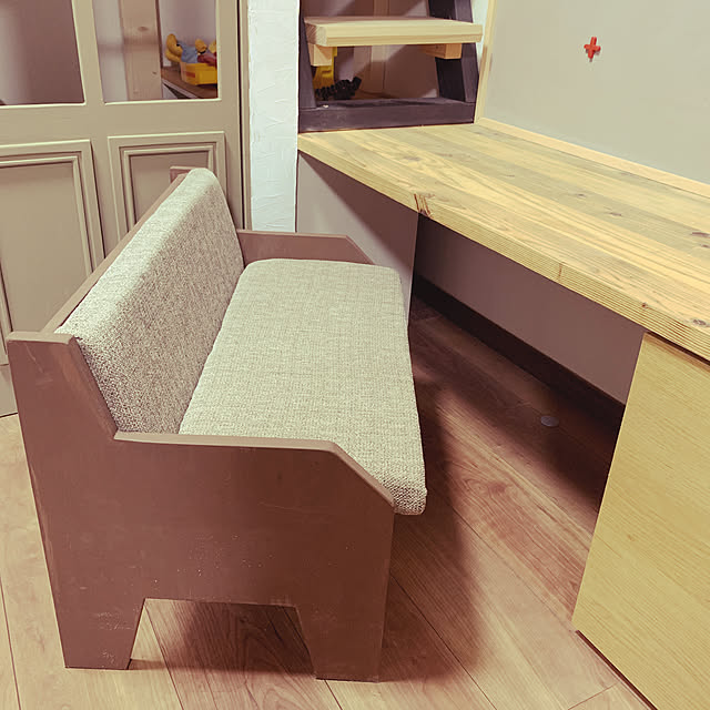 いろいろ工夫して子供用ソファづくり。ここで本読ませるんだぁ。あとレールカーテン付けて秘密基地感だしたら完成