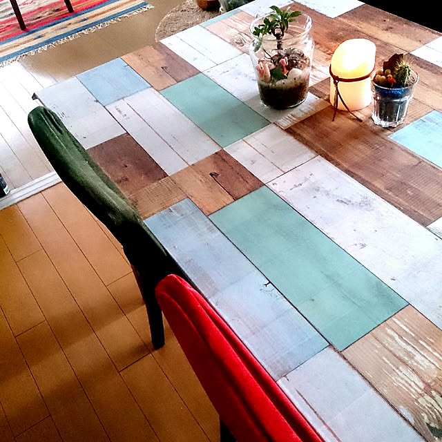 【イベント投稿:ダイニングセット】 天板のシートを木目模様のレザーマットに貼り替えました。 ちょっと思っていた色味と違ったのですが、継ぎ目がなくなったので引っかからなくなってよかったです。 セットのイスは2台壊れてしまったので、違う素材のを実家から譲り受け、チグハグ感がありますが… テーブルが狭いので、スリムワゴンの上段にティッシュやリモコンケース、下にゴミ箱を収納して置いてます。 キャスターで動かせるので掃除もしやすい️⭕️