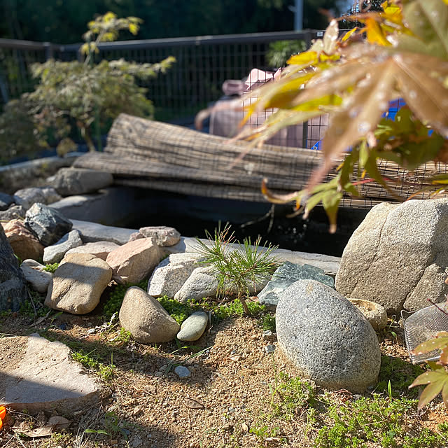 池に岩を組んでポンプを隠し苔を貼り付けてあります。これからどう広がるか楽しみです♪