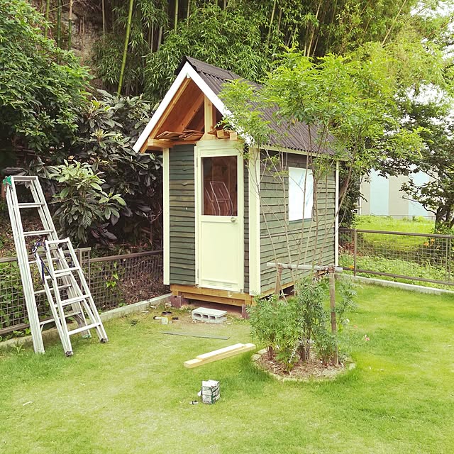 基礎やってます。セメントやらブロックやらで 私の車の後ろに置いてあるからちょっと邪魔(>.<) 私には 「どんな小屋にするかデザイン考えといて」って。色々検索し 考えてます。