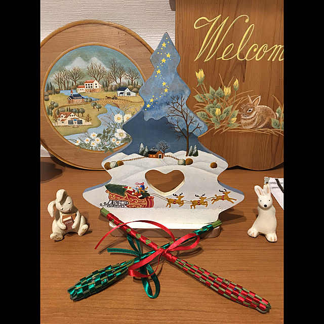 今日は、玄関の下駄箱の上の模様替え。 若かりし頃に習ってたトールペイントの作品を引っ張り出してきました😊 お世話になってた先生や、一緒に習ってた、仲良くしていただいてた方たち、お元気にされてるかなぁ〜なんて、懐かしみながら‥。 サンタさんやツリーをあっち向きにしたり、こっち向きにしたりして、配置に悩みましたが、なんとか落ち着きました。✨