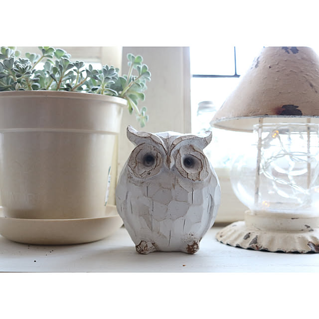 右上は「見ざる、言わざる、聞かざる」のポーズをしたフクロウの陶器の置物。見えてるし、クチバシ隠れてないから多分言えちゃうし、そもそも羽当ててるところに耳あったっけ?というツッコミどころ満載な可愛さがフクロウグッズ蒐集家にはたまらない。笑