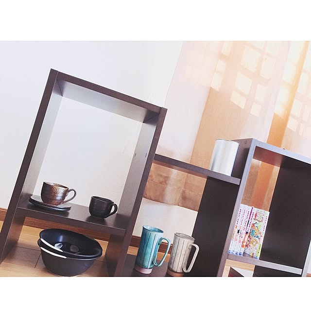 理想の形を設計し、木材で製作、突っ張り棚に乗せてます(*^^*)