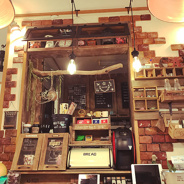 キッチンの煉瓦タイルの目地入れ ゴールデンウィーク中に完成しました(*´꒳`*) 手前のカウンターの腰板がベタ塗りのままなので ちょっとアンティーク加工したいと思います♬ 爽やかインテリアになるように飾る物考えようと思います❤︎