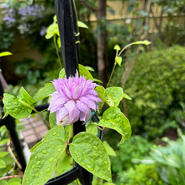 昨日、雨の中で写した写真 1枚目 2番咲のクレマチス、1番が先終わった後トレリスの上部が枯れかかったのでカット,新しい茎が伸びています。 2枚目 雨☔にホタルブクロはよく似合います 3枚目 ニオイバンマツリも2番花 4枚目 唐藤うつぎの紫があちこち舞っています。すぐに大きくなる木なので1本仕立て。上で枝が分かれいます。 電車の中で暇!