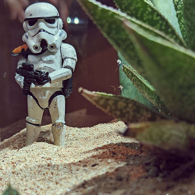 とりあえず砂漠テラリウムに さっきのサンドトルーパーを入れて カメラアングルでごまかしてみた (笑) 柱サボ🌵とガステリアファロー🪴が まぁまぁ根付いててまた植え替えする のも可哀想かなぁ…と様子見に✨ あれからちょい汚れを足して砂に足跡 も付けました👣(ここ重要) でも…… テラリウム自体が狭すぎてなのか サボたち が大きくてなのか…..... さっきのミレニアムファルコン号が置 けない (笑) まそのうち何かに使おうかね💡 横に長い水槽 買おうかなぁ...... いや💨 間違いなく沼る......キリが無くなる..... これくらいにしておくか💨💨💨 あ やんわり背景 作るかな🛠 にしても..... いい感じ✨(*´罒`*)♡ 満足度90%だな🎶