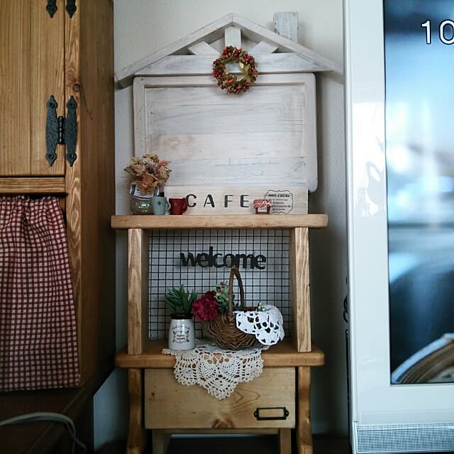 古い糸巻きには 昨年最後のお花見になってしまった亡きワンコの写真をかけて