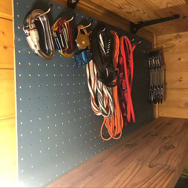 全体が掴みにくいガチャ棚のアップ クライミングギアの収納に有孔ボードを設置