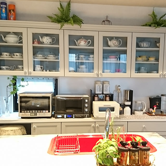 キッチンからの眺めをとにかく良くしたいと思います(*´ω`*) 赤いキッチン、ミントグリーンのカーテン、英字のウォールステッカー、好きなものがごちゃごちゃですが。 多肉成分はどこに取り入れよう…