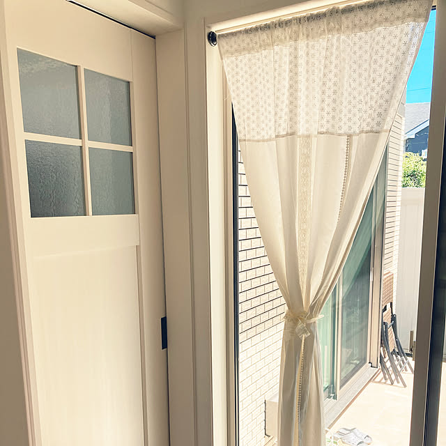 庭側の目線が気になったので、アンティーク調突っ張り棒で大きめカフェカーテンをつけました。リボンはダイソーです。