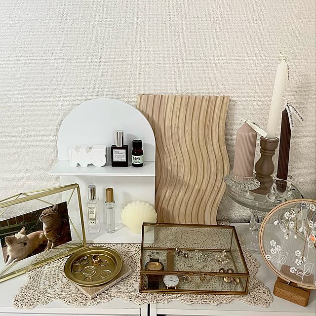 ちょっと曲線的なアイテムが欲しくて、ウォールミラーはアーチ型にしました。 楽天で購入したウォールミラーはサイズが豊富!レビューが少なく不安でしたが、 時間はかかったものの無事に届いてくれて安心👏賃貸用の壁掛けフックを購入して設置しました!