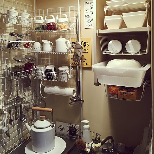 年明け購入したフライパンを収納するべく見直しました。 我が家は二世帯住宅なので二階はミニキッチンです。ただシステムキッチンのような引き出し仕様ないので収納力が心許ない( ´・ω・`) そこでニトリでシンク下ラックを購入して設置しました。フライパンやホットプレートの鉄板はダイソーのファイルボックスで立てて収納。 半透明で角張った質感のインボックスはブレンダー収納にしています。ある程度中身が見えた方が取り出しやすいのでこういう収納にぴったり。 これでかなりスッキリまとまりました✨