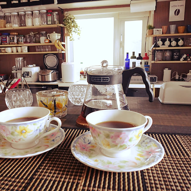 みなさんのお宅の様にキレイな物件でない上にインテリア映えしない写真で ごめんなさい💦 我が家のコーヒー&お茶セットは ココにまとめています。 収納が本当に限られているので 同じ種類のガス台ラックとやらと、 通常ラックを2段に重ねて収納スペースを作ってます* ラックは以前、行きつけスーパーの 閉店セールでall500yenの中から 買った物です☆ さり気なく、吸水マットは まな板スタンドの後ろに立てて しまっています♪笑 最近、忙しくてもコーヒータイムを 設ける様にしたら カフェへ行きたい欲求が少し減らされ ちょびっとだけ節約に♡笑 ポイントはTVも消してYouTubeで 好きな曲をかける事です♪
