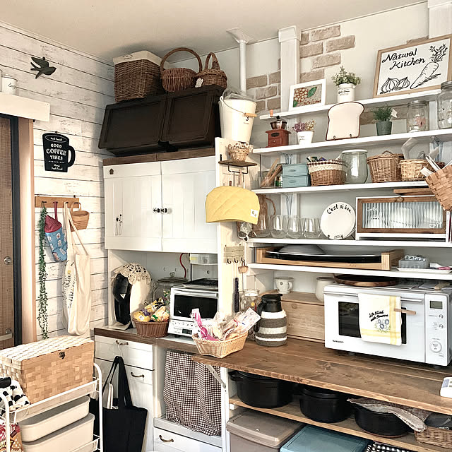 カップボードに棚が欲しくて、雰囲気見るために試しにおいてみた棚が意外と良い感じ? しばらくこのままで…♡