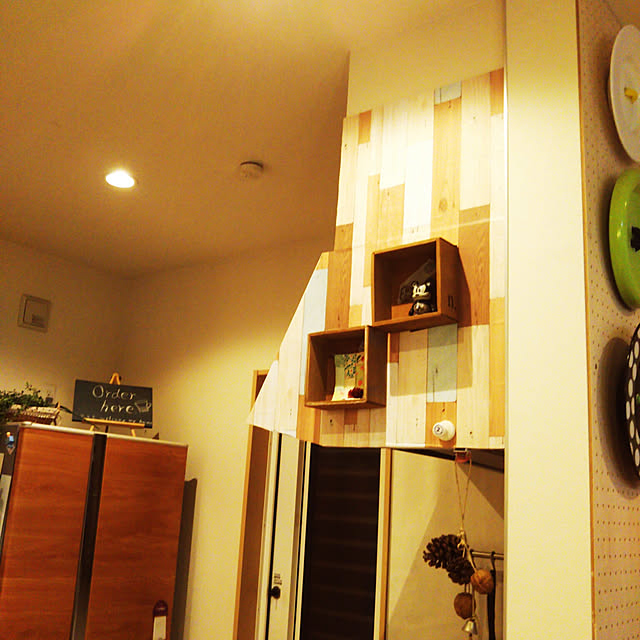 わかりにくいですが、キッチン後ろの壁をセリアのストライプの壁紙に変えました(^∇^) かわいい(ノ≧▽≦)ノ 600円でいいしごとしてる♪ 完全なる自己満足です(*´∇`*)