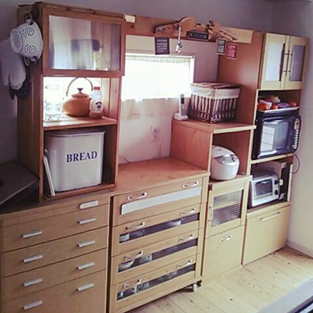 Mar.17,2019 奥の食器棚が10年以上前に購入したニッセンさんのものですが、天板の厚みのあるモールディングに惚れています(//∇//) 隠れちゃってるけど、トースターを置いている部分の背面と、側面が板壁になっている点も可愛くて…(*´-`) 普通の食器棚からこのニッセンさんのものに変えたら、キッチンの雰囲気が可愛くなり、雑誌にキッチンを載せてもらえたという幸運な出来事もありました(^^) 可愛くて良心的なお値段の(^^)この食器棚に出会えて本当に良かったと思っています。