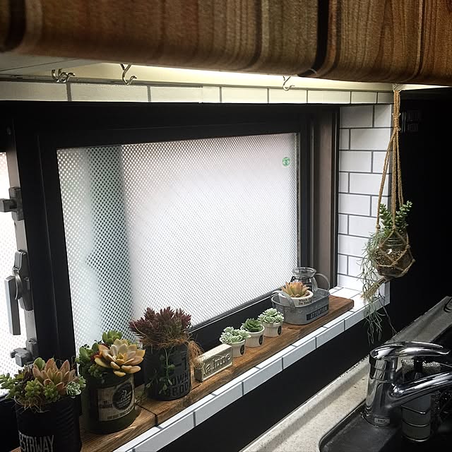 キッチンの窓辺は何もないとさみしいので、サボさんなど、植物置いて☆窓の上には、お気に入りのアイアンかけて☆可愛くデコレーションしましたっ❤️ ここで、植物を見て癒されながら、お部屋にある植物たちを持ってきて、お水をあげています(≧◡≦)