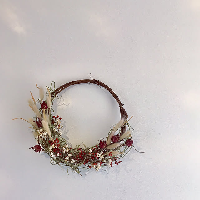 白色の花に木の実の組み合わせ、もしかしたらmちゃんも作ってるリースと同じような感じになってしまうかな?と思ったので、お二人には許可をいただきました。
