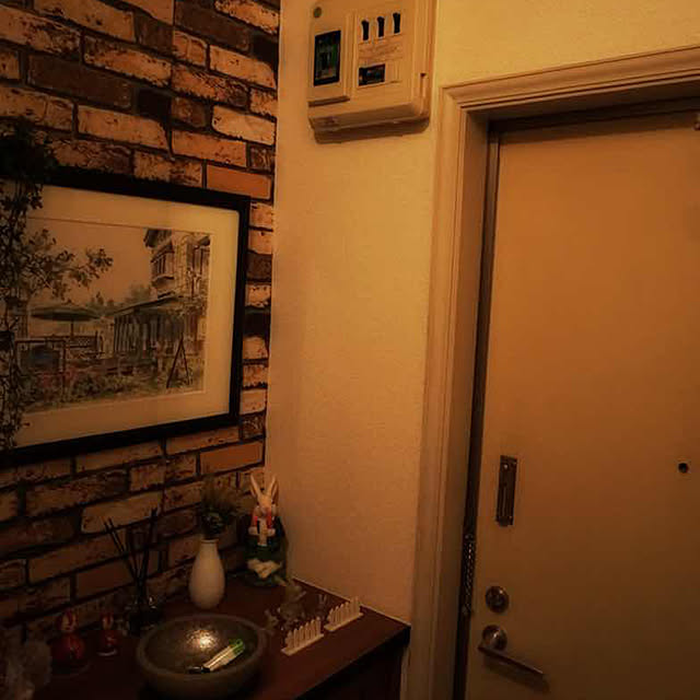 コンテスト用に久し振りに玄関を引きで。 壁にはリメイクシートと壁紙、床にはクッションフロア、照明も付け替えて、配電盤にカバーと、あちこち手を入れたので一番変わった場所です。