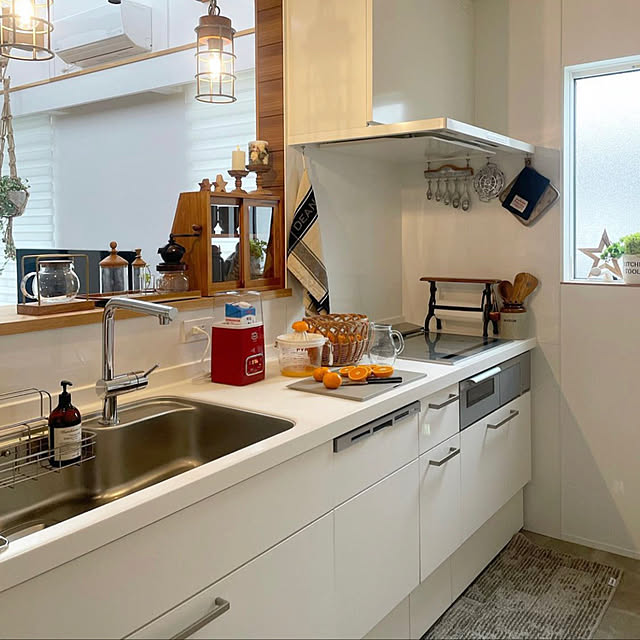 リノベーションの際、キッチンはどうしてもウッドワンのスイージーにしたかった。水栓は憧れのグローエのグースネックにしてもらった。やや水ハネはするけど、逆にすぐ拭くクセがついてキレイを保てるかも(笑)