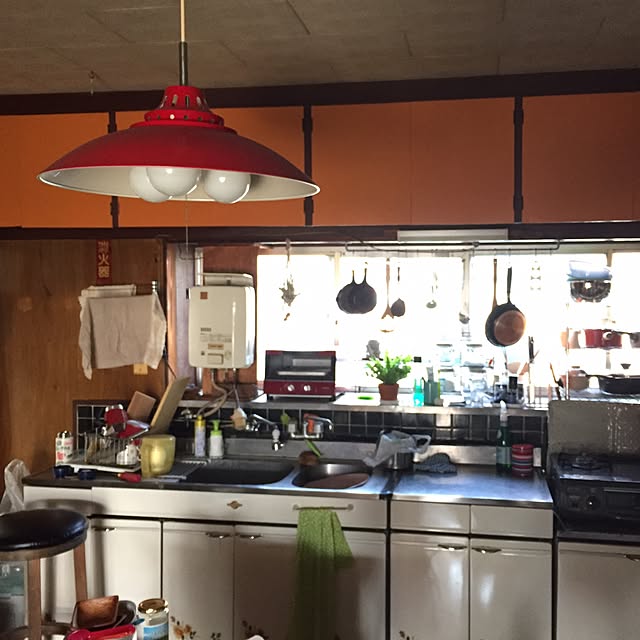 キッチンとゆうより台所と言ったほうがしっくりくる。 ガスコンロは業務用の中古を使ってます。シンプルなデザインで余計な機能もついてないしかなりお気に入り! それでも気に入らないところばかりなのでディアウォールで改造計画中。。