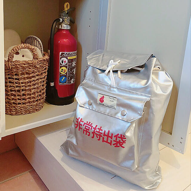 モニターでいただいたおしゃれ消火器 おしゃれだからすぐそこに置いてもかわいい いつも目にする場所、手に取りやすい場所にあれば家族も消火器を認識しやすく誰でもすぐ消火作業できます トイレ前のデッドスペースに防災用品まとめてます。 長期避難→スーツケース 短期避難→リュック 確実洋服等をつめる為の空の使わなくなったリュック カセットガスで使えるマル暖 水2cs 長期保存用野菜ジュース 水と野菜ジュースはローリングストック 普段は端切れを縫い合わせた布を突っ張り棒にひっかけて目隠し