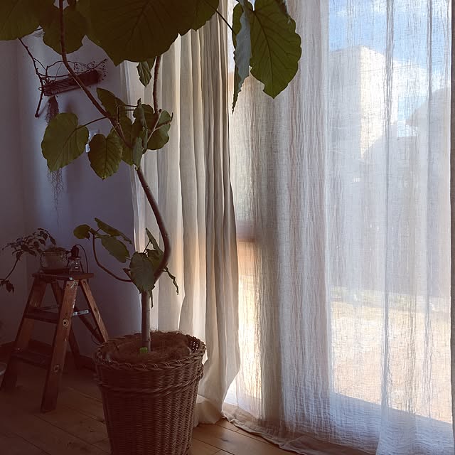 外側からは誰も通らないし、そのままだと古くて大きな窓がむき出しになってしまうので、あえて透け感のある布を選んでカーテンを作ろう!と思いましたが、生地を選んでポールにかけてみたら、意外とそのままで雰囲気よかったので完成にしちゃいました😁
