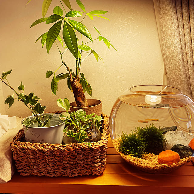 1️⃣日差しが強い日は、以前使っていた竹製ランプシェードで水鉢に蓋をします。