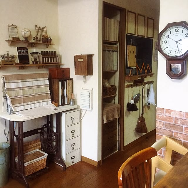 ごちゃついてますが、ここに好きな雑貨を集約している為です🤭笑 作家さんの作品が好きなので、ハンドメイドのマーケットによく出かけます♩あとはアンティークショップとか…^ ^ 2枚の写真は壁を挟んで背中合わせ。 全然雰囲気が違いますが、どっちも見ていて楽しいです😊