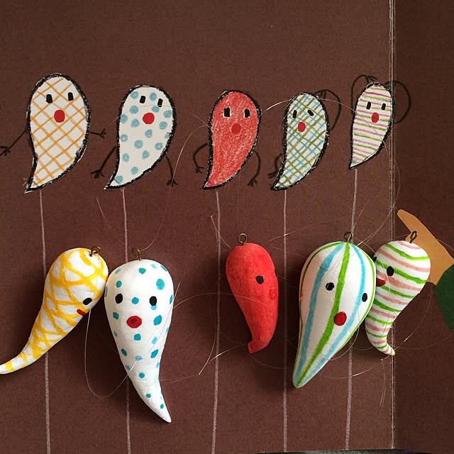 せなけいこさんの「おまつりおばけ」より、おばけ風船を作りました。本当は白い普通のハロウィン用おばけにしたかったけど…娘のリクエスト。 この後モビールにして飾るよ(*^^*)